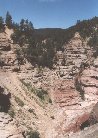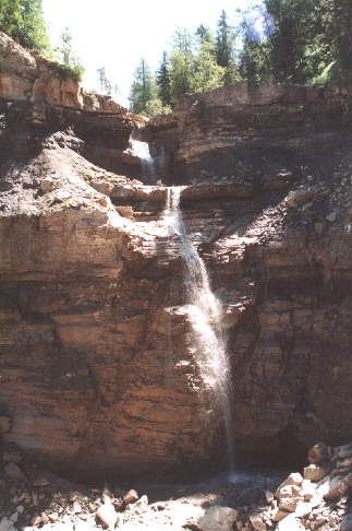 ![]() Wasserfall am "Butterloch" im Grödner Sandstein mit zu oberst Dolomitkalkbank ("Cephalopodenbank") |