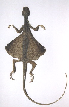 Draco spilopterus, heute noch in Asien lebender "Flugdrache", Länge ca. 12 cm |