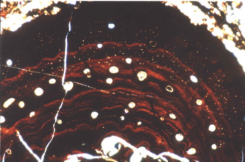 Dünnschliff einer Rippe mit sichtbaren Knochenzellen und -lamellen sowie Versorgungskanälen (hell) |